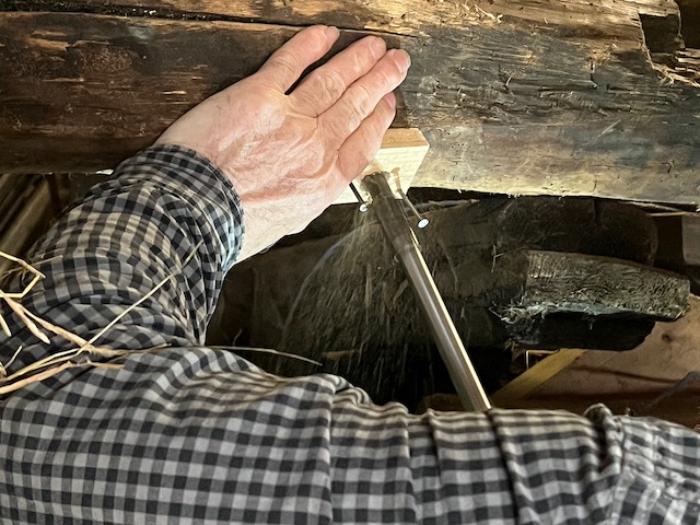 Malgré ces obstacles, M. Lohrum a fait preuve d’une détermination remarquable. Tel un équilibriste, il a escaladé les piles de bois, se faufilant sous les palettes et entre les poutres pour prélever les échantillons nécessaires. Contre toute attente, les pièces massives en chêne, comme les sablières basses ou les poteaux principaux, se sont révélées inadaptées pour une analyse précise. Nous avons appris une leçon précieuse : ce n’est pas la taille du bois qui compte, mais le nombre de cernes et la présence de l’aubier. À Buethwiller, plusieurs échantillons ont révélé que le bois utilisé était jeune, issu d’arbres à croissance rapide et abattus précocement, contrairement à ce que leur imposante section laissait supposer.